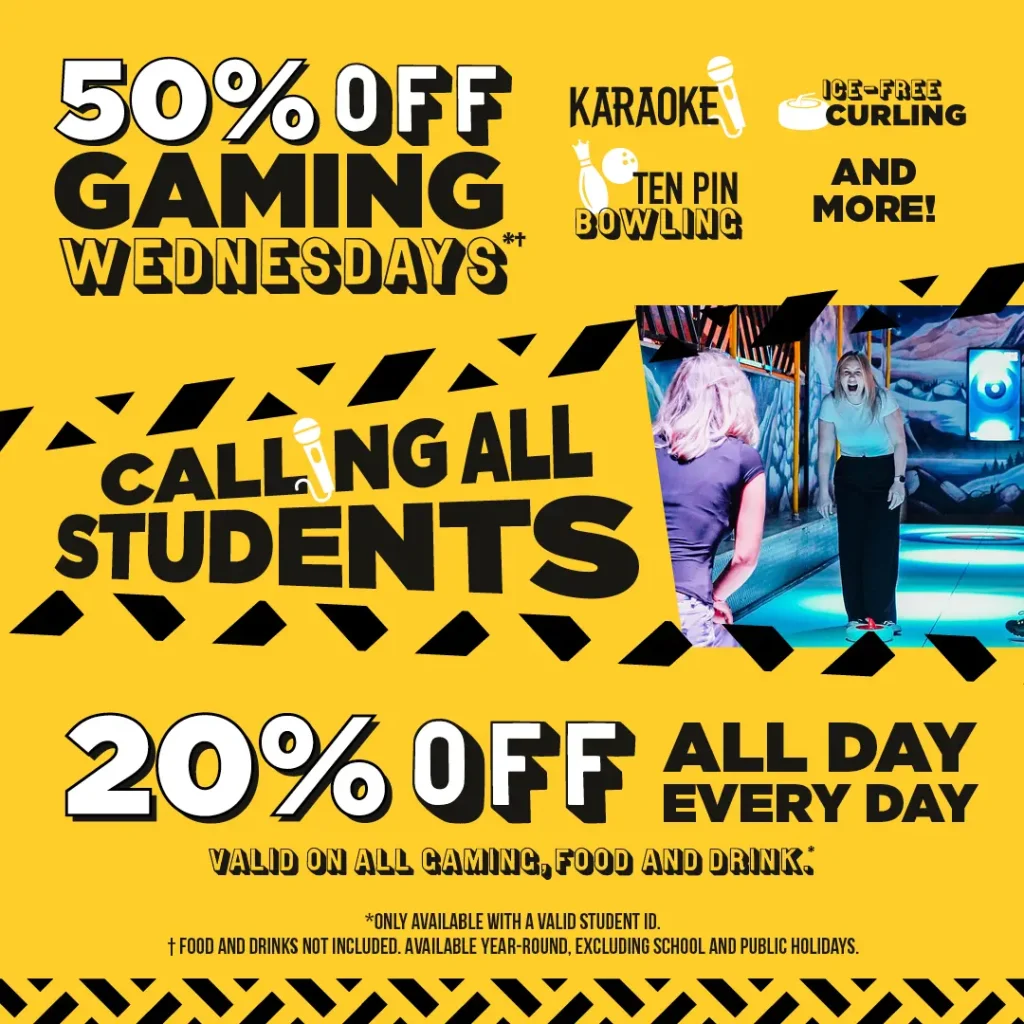 This includes: Ten Pin Bowling, Duck Pin Bowling, Tech Darts, American Pool, Ping Pong, Batting Cage, Shuffleboard, Tech Shuffleboard, Bankshot Shuffleboard, Supercharged Shuffleboard, Crazy Pool, Ice Free Curling and Karaoke. Gaming choices vary depending on venue. Excludes Arcades. Excludes school & public holidays.