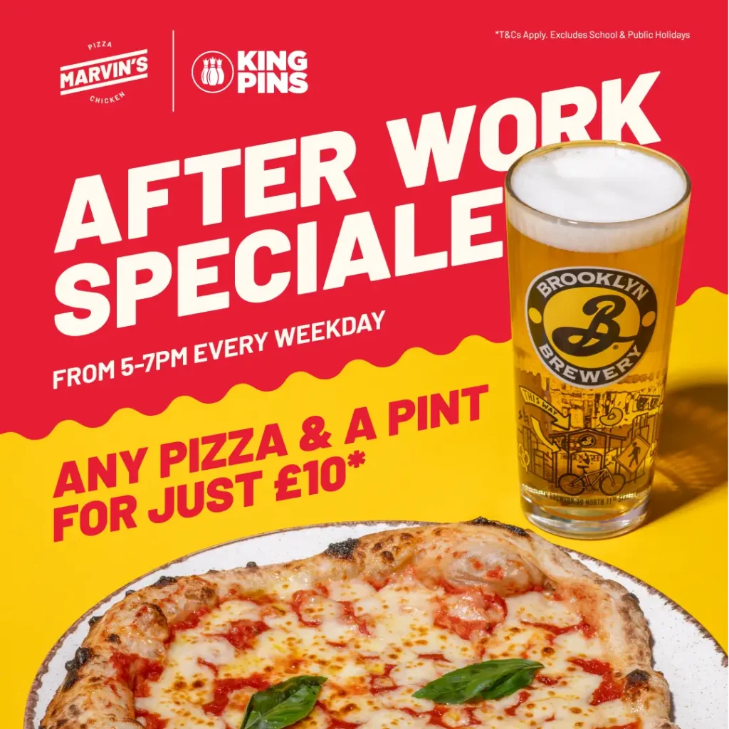 Enjoy a pizza and a pint for just £10. Every weekday from 5 ’til 7pm.